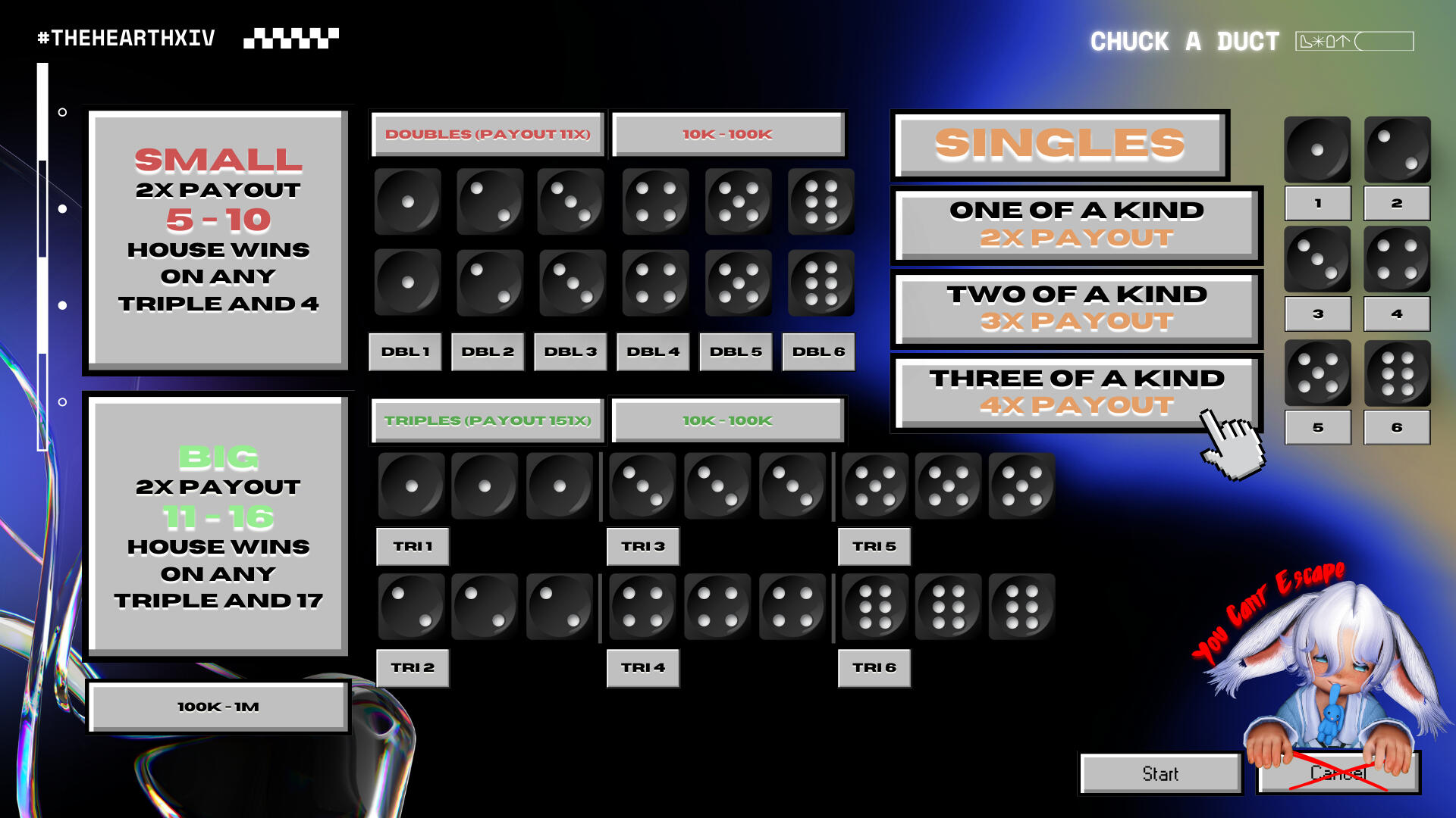 Payout: 11xTRIPLE (TRP): players choose which number will appear on all 3 dice (111, 222, 333...)